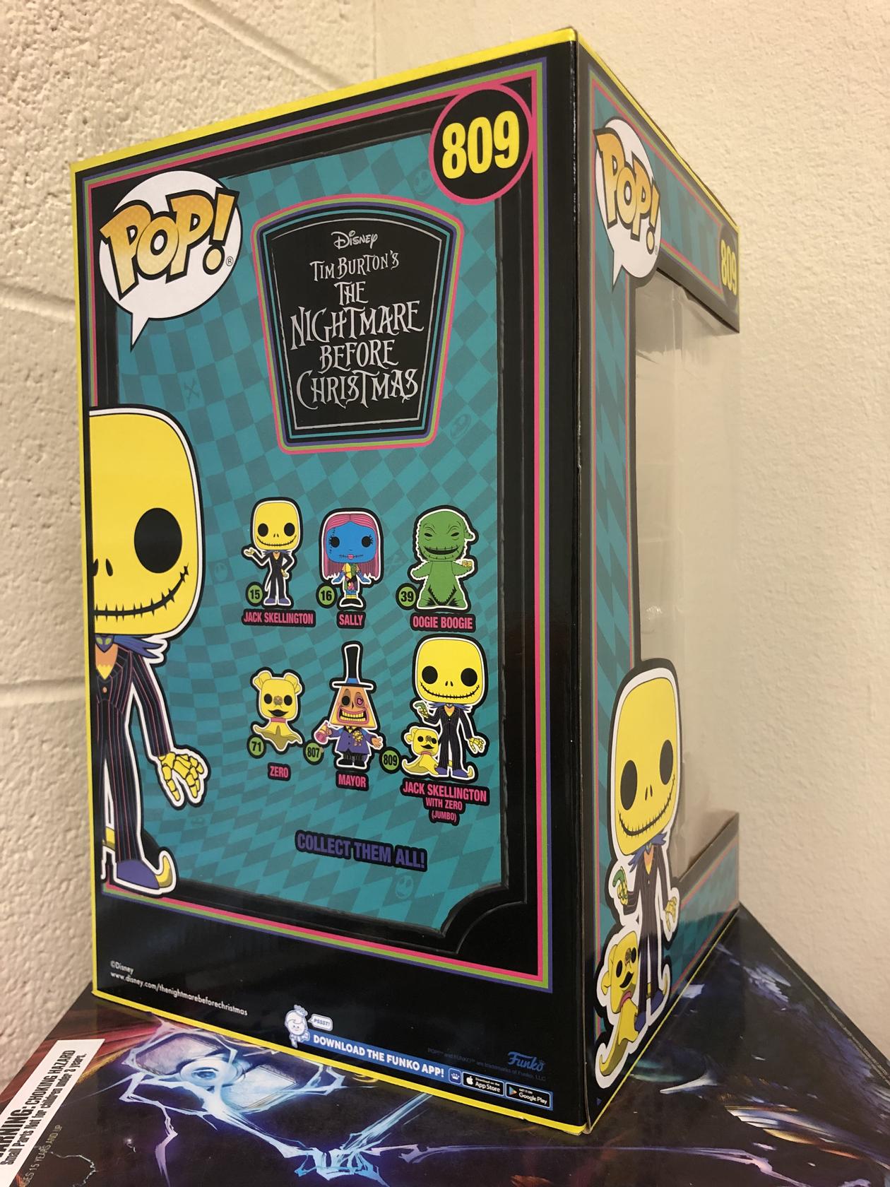 - Treat yourself to a fetching addition to your The Nightmare Before Christmas collection! This Jumbo Pop! Jack Skellington with Zero appears in vibrant coloring that is designed to shine brightly under blacklight. These buddies from beyond are sure to inspire a playfully spooky atmosphere wherever they go.